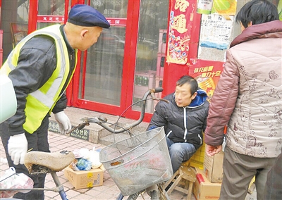 没想到的是,当老人推着车筐里装满菜的自行车从红旗区实验小学与牌坊街出口走上平原路后,竟又自己摔倒了,自行车翻到了一边,车筐里的菜也撒了一地。而这时,有多名行人和车辆从摔倒老人身边路过却无人伸手帮一把。在远处看到这一幕的老王放下手中的笤帚,快步走到跟前将老人扶了起来。看到老王将老人扶起来后,附近烟酒店的一名商户也走上前来一起将老人搀到了路边。