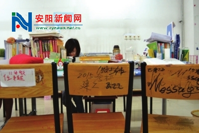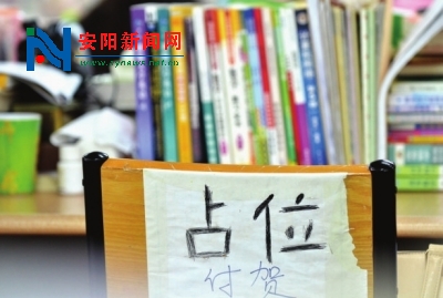 近日,教育部宣布将2015年考研时间提前到2014年12月27日至28日,这是近年来首次将时间提前至元旦前。面对如此紧张的考研时间,各大高校的自习室里也掀起了一场“占座大战”。 记者在安阳师范学院逸夫图书馆一楼的自习室看到,瓶装水、便签纸、一摞摞的教材、铁锁等都成为占座利器,不少学生纷纷贴出“禁止重占”、“此座已占,考研备考”、“动必倾全力血拼”等各种霸气纸条,让考研教室弥漫着一股硝烟味。 不过,据准备考研的学生表示,虽然占座场面很疯狂,但入座率却不高。 见习记者毋怡秋王大川摄影报道