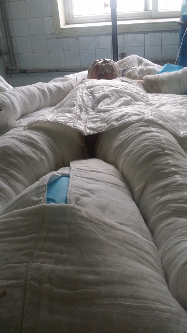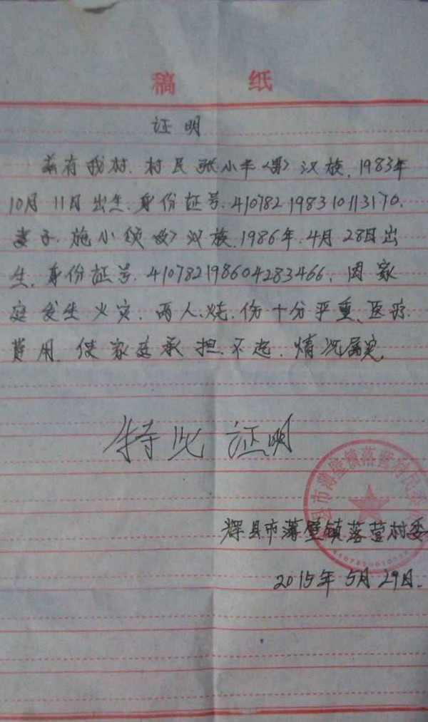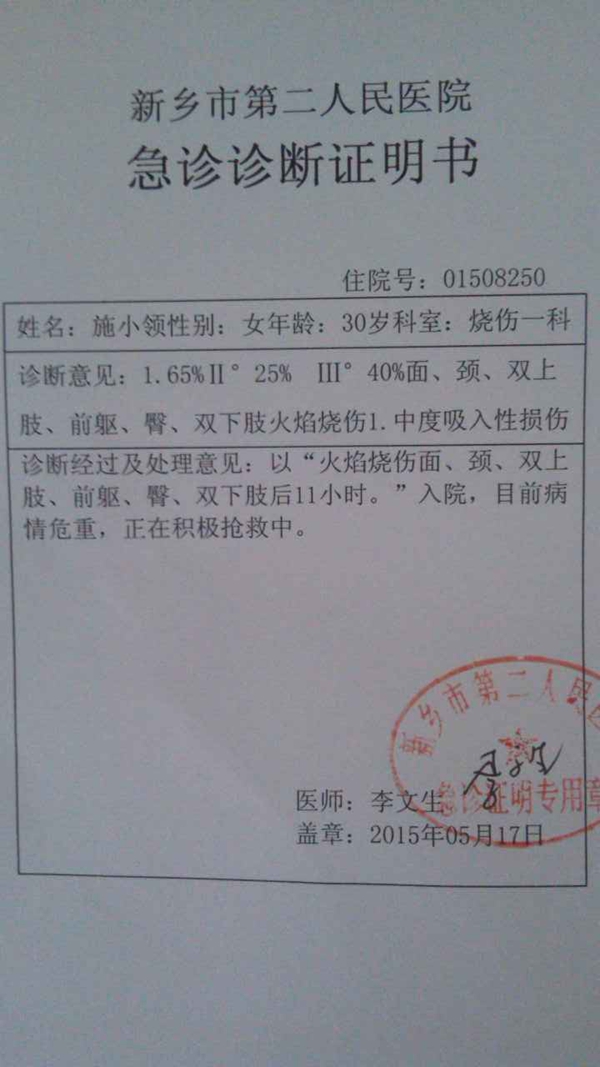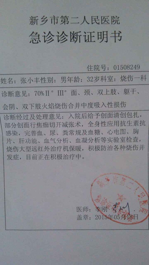 尊敬的父老乡亲、兄弟姐妹们:你们好! 我们原有一个幸福的家庭,我的丈夫张万新1979年至1986年曾在中国人民解放军信阳明港坦克团服役7年。儿子张小丰到了参军年龄后,我和丈夫依然送他应征入伍,继续为祖国的国防建设贡献自己的青春。儿子从2000年到2008年在“中国二炮”服役的八年里,由于刻苦训练,严格要求,先后获得了“优秀团员”、“专业理论训练先进个人”、“优秀士官”等荣誉称号,并连续四次无偿献血。然而,天有不测风云,人有旦夕祸福。就是这样一个和睦、幸福的家庭,却意想不到一夜之间祸从天降,击得我们抬不起头来,几乎到了绝望地步。 5月16日晚,劳累一天的儿子因腿疼用民间偏方“火酒”洗洗,由于不小心,一下竞把火苗引到了腿上。此时的儿媳见状赶忙去灭,但由于过分慌张,却又把盛着“酒精”的碗碰倒,致使酒精全流腿上,两人惊慌之中乱扑一起,结果火苗又迅速烧到了儿媳身上……待乡邻赶来扑救时,两人已烧的面目全非。
