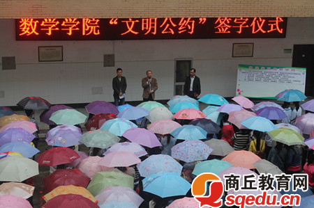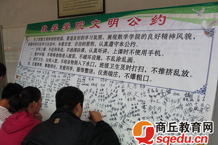 商丘教育网讯 (通讯员 徐乙璐 江河)9月18日上午,信阳师院数学学院在数学楼下举行主题为“创建文明和谐校园,营造良好学习氛围”的《文明公约》签字仪式。该院党总支书记柳士刚、副书记何永、团总支老师刘勇华等出席并指导此次仪式,2014级全体学生参加了这次活动。 首先,刘勇华宣读了《文明公约》的主要内容,并对数学学院全体学生提出了文明上课、爱护环境、讲究卫生、注重修养四条希望。接着,柳士刚进行了发言,他号召同学们自觉遵守《文明公约》,从自身和小事做起,常抓不懈,不断积累经验,勇于实践,提高文明水平。我们深知,大学生文明礼仪的培养是一项系统工程,是每所大学都十分重视的一项长期任务。该院以此次公约的出台为契机,在学生中普及日常礼仪知识并且制定了一系列条款,达到加强监督与管理、共建文明学院的目的。整个活动,过程紧凑,声势浩大,效果显著。 一直以来,数学学院始终把学院的文明礼仪建设放在突出位置,此次仪式展现了该院的良好精神风貌,彰显出中华民族礼仪之邦的美称,有助于提高学生的综合素质。