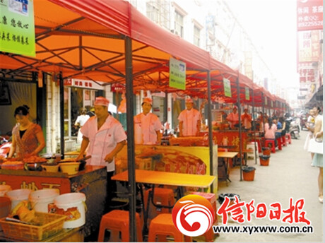 信阳师院东门是我市早点夜市、小饮食店相对集中区域,人员流动性大,情况复杂,管理难度大。浉河区金牛山办事处严格对照创卫标准,结合实际,对流动摊点进行归行划市,投资2万余元划专区编号统一管理。图为整改后干净整洁的餐饮一条街。本报记者 邹乐 摄