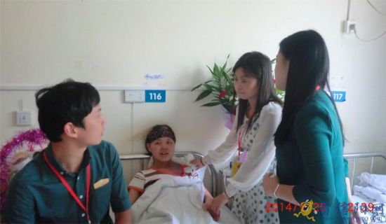 2014年9月25日上午11点,信阳红十字会苏博楼企爱心社的志愿者们一行10人来到河南省肿瘤医院看望癌症妈妈肖婷婷,为其送去鲜花、水果和50000元求助金。此次活动受到了,信阳市红十字会有关领导的关注,是该市“关爱母亲行动”的又一次实践。 肖婷婷是河南省信阳市人,今年2月份经诊断患乳腺癌,在河南省肿瘤医院进行治疗。高昂的医药费使本来困难的家庭雪上加霜。肖婷婷曾一度犯傻想轻生解脱,说是为其丈夫和5岁乖巧女儿减少痛苦。肖婷婷在向信阳红十字会提交了“信阳市关爱母亲行动求助申请表”后,引起了红十字会领导的高度重视,经过红十字会实际调查、走访,了解到肖婷婷家庭确实困难符合救助条件,紧急组织红十字会苏博楼企爱心志愿者们一行10人驱车从信阳赶赴郑州看望这位年轻美丽的癌症妈妈。 信阳红十字会苏博楼企爱心社的爱心使者们,鼓励肖妈妈树立信心、克服困难,坚定战胜病魔的意志,祝愿她早日康复,让她真切感受到来自党和社会各界的关怀,增强她战胜困难的信心和勇气,早日回归家庭的温馨,为建设和谐社会做出积极贡献! 据了解,信阳市“关爱母亲行动”是以“为了母亲,为了明天”为主题,每年对130位罹患妇科恶性肿瘤等重大疾病、生活特困的母亲,生活特困的失独母亲,坚持养护残障子女、生活特困的母亲,生活特困的空巢母亲,生活特困的农村独女户或双女户母亲实施救助。