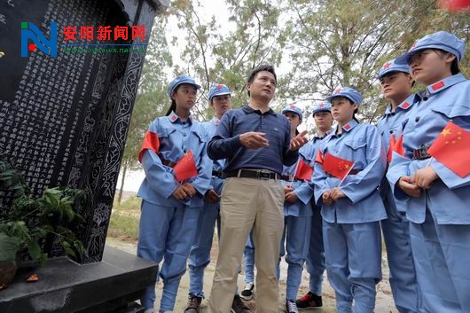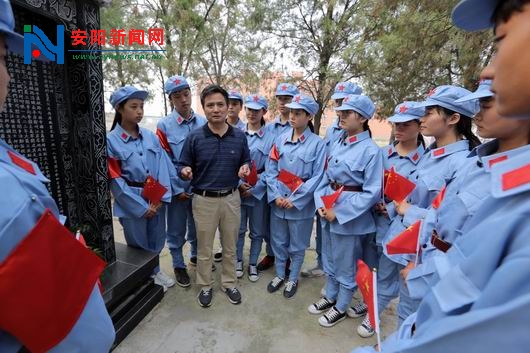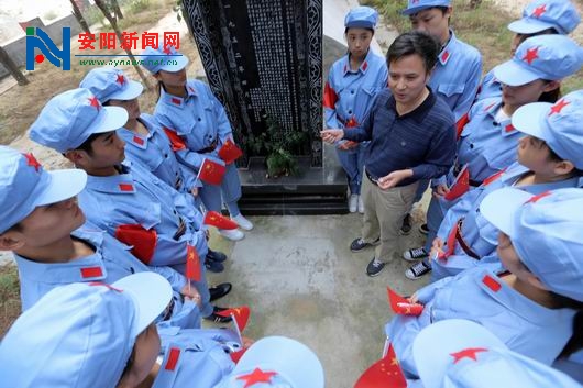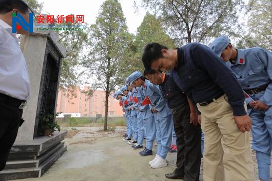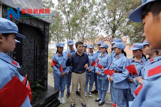 汤阴县职教中心校园内里,“二七烈士”司文德墓碑前,该校校外辅导员、汤阴县延安精神研究会会长肖天顺正在给学生们讲解长眠在这里的司文德烈士的故事。