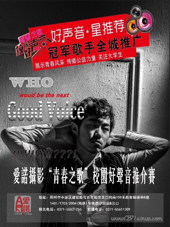 视野决定高度,责任创造价值!中原万达、中原国际眼镜城一直在行动,随着大学生青创推广计划暨青春之歌100场巡回推介赛的启动,好声音将活动的主题:赏识、公益、责任、梦想,在全市流行开来。 展示青春风采、传播公益力量,10月31日-11月1日(旧稿),好声音中原万达站邀你来唱,梦想基金让每一个有音乐梦想的歌者都可以梦想成真!据了解:主办方还特设了最佳人气奖、互动奖,为加入公益好声音的歌手加油助力。 在这里,你的音乐梦想变得触手可及!只要你年满18周岁,只要你爱唱歌,就可以参加!还等什么,赶紧来吧,放飞你的音乐梦想,让你的好声音震撼世界! 校园好声音全城火热招募!拿起你心爱的那首歌,用你直击心底的声音来打动我们,唱出激情唱出青春飞扬。 用音乐打动心灵,用公益传播影响。在这场青春之歌声动中原的音乐旅程中,以青春的名义,我们一同坚持向上的力量。 快乐星播客star、雯文影视、爱诺摄影、旅拍摄影等社会公益力量全程录制,魅惑无可阻挡! 好声音携手36家省会主流媒体与你共同见证校园歌手的荣耀与传奇! 我们的目的:打造河南本土公益音乐力量传播平台,引导省会周末休闲娱乐新时尚。并以此为纽带,吸引优秀大学生参与到正能量事业中来,展示大学生优秀素质和风采,推动社会关注和支持大学生就业创业,构建学生和企业赏识交流快捷渠道。