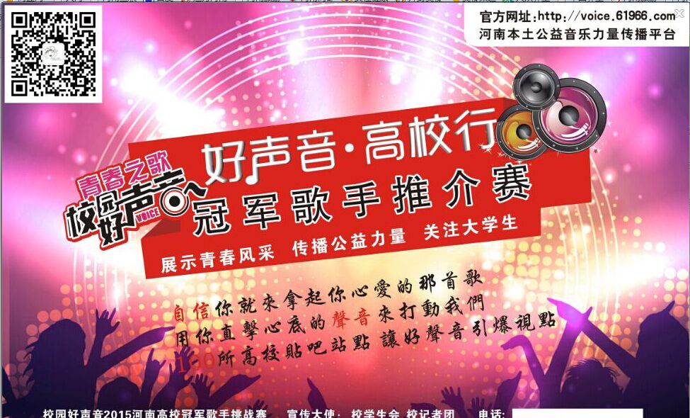 青春之歌100场系列活动之高校行 (开封大学校园音乐人气推广方案) 青春是支歌,在这里你的音乐梦想变得触手可及!只要你爱唱歌,就可以参加!还等什么,赶紧来吧,放飞你的音乐梦想,让你的好声音震撼世界吧! 冠军歌手全城推广,拿起你心爱的那首歌,用你直击心底的声音来打动我们,在这场青春之歌声动中原的音乐旅程中,以青春的名义,我们一同坚持向上的力量。情系本土,有爱就有喝彩! 用音乐打动心灵,用公益传播影响! 据了解:主办方本次活动还特设了最佳人气奖、互动奖,为好声音的才艺歌手加油助力。 活动名称: 青春之歌校园好声音之《好声音推介赛》 活动主题: 赏识、青创、责任、梦想 比赛形式: 校内——校园现场竞赛 + 歌曲定向式选拔 选手招募: 9月28日起全网宣传,同时开设网络报名及现场报名,并持续升温。 报名条件为:年龄在18到30岁之间,五官端正,形象气质好,声音甜美,具有亲和力。 第一场推介拟定:时间···· 地点···· ; 推介着重考核选手的仪表形态、才艺展示、语言表达等个人的基本素质。评审过程为评委+人气表赞新模式,由活动所在校园学生组成。 评审由组委会领导、礼仪专家、嘉宾老师、特邀企业代表等组成。最终由评委审定出本场优秀人气选手。 活动目的: 打造本土公益音乐力量传播平台,引导省会青春休闲娱乐新时尚。并以此为纽带,吸引优秀大学生参与到正能量事业中来,展示大学生优秀素质和风采,推动社会关注和支持大学生就业创业,构建学生和企业赏识交流快捷渠道。 好声音编辑部助力传播河南好声音: 一、1、艺术团, 2、广播站, 3、记者团, 4、社联、 5、宣传部、6摄影协会,其他的社团。 二、推荐主持人3-5人,歌手,乐队12-16个。 通过本次活动着重推广参与社团、扩大社团在校园的影响力
