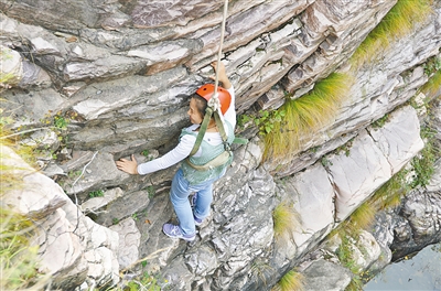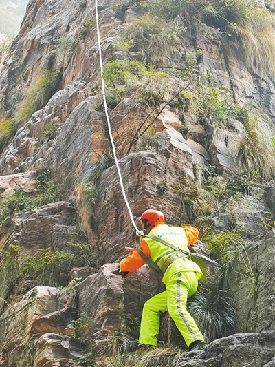 刘建成将要下的山崖是九莲山上相对比较危险的一处,这里的悬崖基本上和地面垂直,只是偶尔有些地方有些小凸起,崖上距地面160多米。娴熟地翻越过跨栏,刘建成就开始下崖了。“放绳,放绳,好,就这里。”他动作熟练,但又小心翼翼,嘴里还不时指挥着崖上的同伴。垃圾捡到后,他就放在垃圾袋里。就在他上下左右游走之际,崖上散落的垃圾被一一捡拾干净。