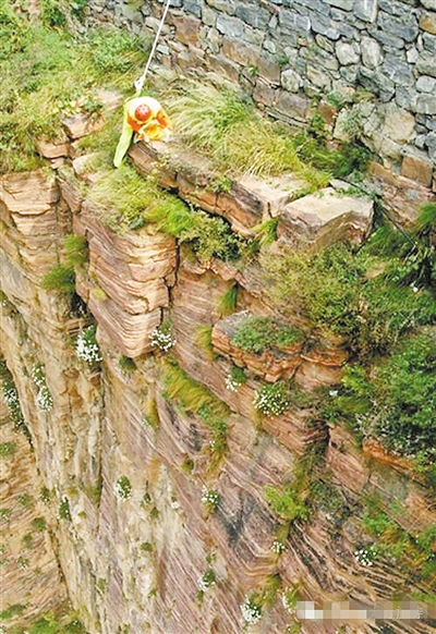 半个小时后,刘建成从崖下爬上来了,他边摘安全帽边说:“又捡干净一处,你看这边现在多好看啊。”的确,没有垃圾的“点缀”,悬崖上的山菊花显得更加风姿绰约。