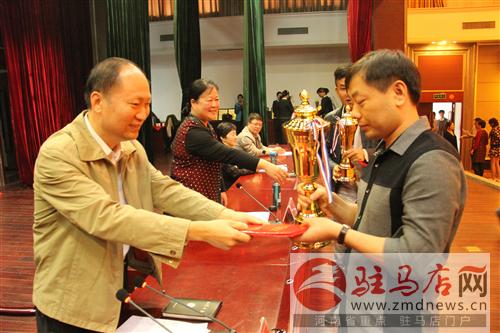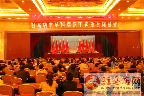 闭幕式现场 闭幕式舞蹈表演 获奖代表上台领奖 驻马店网讯(本网民生部 周由 梁博涵)经过为期4天紧张、有序、激烈的比赛,10月16日下午,驻马店市第四届职工运动会在市总工会礼堂正式闭幕。市总工会党组书记、副主席蔡新国参加闭幕式并讲话。市体育局局长刘新红主持闭幕式。 闭幕式对比赛项目获奖单位进行了颁奖。 本届运动会于10月14日开幕,来自各县区及市直单位的61个代表队,共计2200多运动员参加了10个大项23个小项的比赛。经过激烈角逐,汝南县、驿城区、泌阳县获得了县区组团体总分的前三名;市卫生局、市公路局、市住建局获得了市直机关组团体总分的前三名。另外,汝南县、驿城区、开发区、市政府、市卫生局等10个代表队获得了“优秀组织奖”;正阳县、市委办、市财政局、市民政局等10个代表队获得“体育道德风尚奖”。 颁奖结束后,来自市统计局和市住建局的广场舞代表队还为现场观众带来了精彩的舞蹈表演。