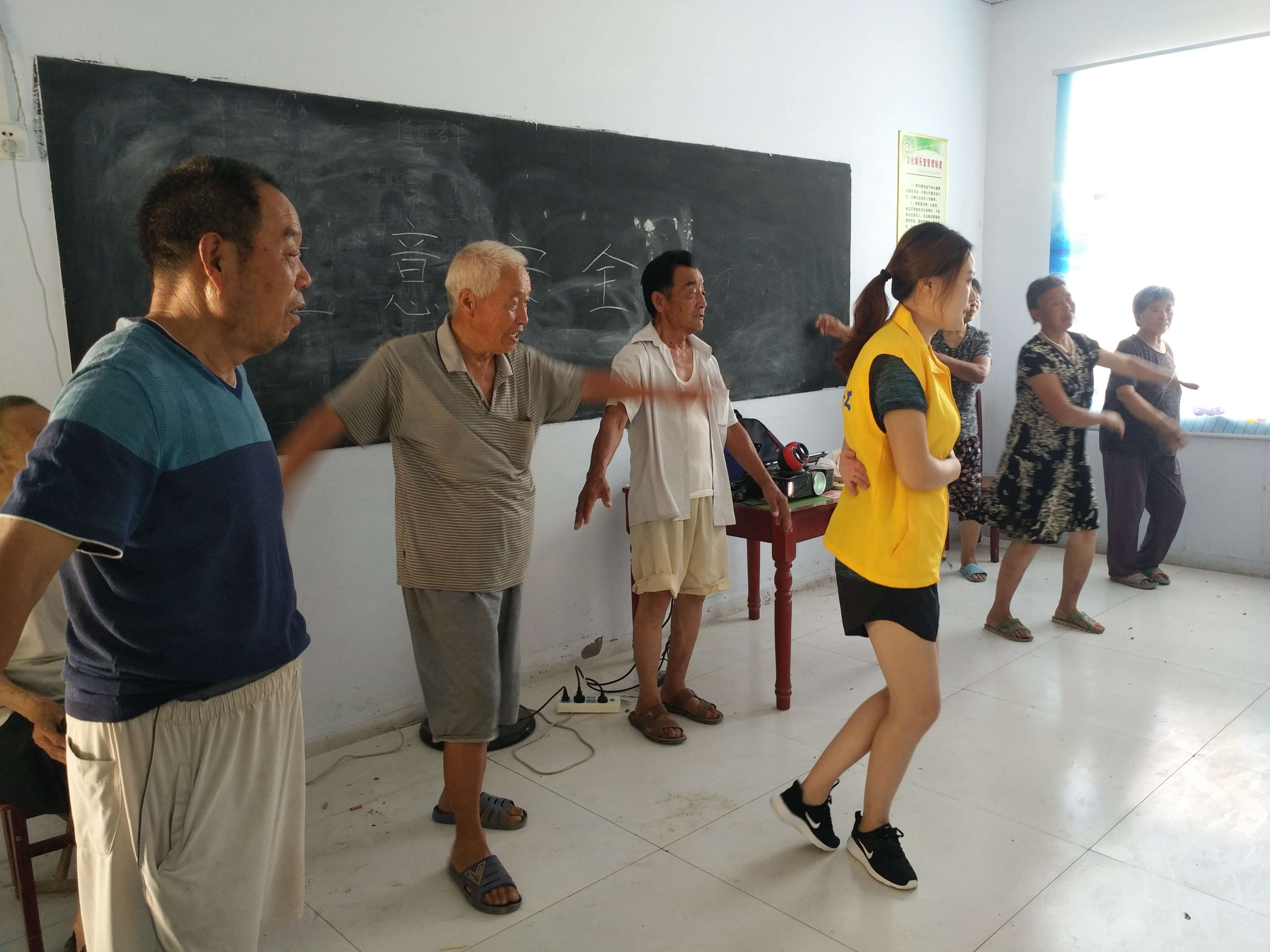 2017年7月11日上午,兰考县启航社会工作服务中心的社工在贾寨幸福院开展了“舞动人生、你我同乐”广场舞兴趣小组的第四节。 太阳火辣辣的烤着大地,不远处传来知了的声音,小组中大部分长者还是顶着酷暑赶到了幸福院参加此次广场舞兴趣小组。因此节小组时最后一节,社工首先带领组员们复习了前三节的内容,大部分组员都能够跟着歌曲跳出来两支舞蹈,社工对个别组员进行了指导。 相对于前三节的广场舞小组,长者们由刚开始对广场舞不太了解逐渐体验到了广场舞的乐趣;组员们也增加了更多交流,有位长者还将自己以前学过的舞蹈与其他长者一起分享和交流。 此次小组活动丰富了老人的精神生活,提升了老年人的学习能力,加强了老人间的交流,同时也增进了老人跟社工的感情。重要的是,这次小组活动帮助这些老人培养了兴趣,社工也将为他们提供一个自由的平台,让这个兴趣发展下去,让老年人发挥余热,生活更精彩!