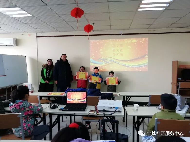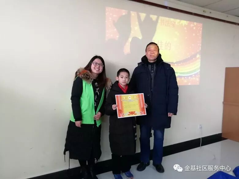 2018年1月28日上午,由金基社区服务中心项目开展的社区特色服务之一“书法公益课堂”如期开展。由于春节将至,加之天气寒冷,年前的“书法公益课堂”从今天起就结课啦,春节过后“书法公益课堂”继续开展。 本次“书法公益课堂”伊始,负责授课的徐老师对孩子们之前学习的内容,进行了回顾,以加深孩子们的记忆,巩固学习成效。重温过后,徐老师对这一段时间开展的“书法公益课堂”做一总结,徐老师说:“首先,很感谢玖久社工给我提供这样一个平台,让我能够在晚年利用自己的特长服务社区居民,发挥自己的余热,也感谢孩子家长的信任,愿意让孩子们参加书法公益课堂的学习,最后我想说的是孩子们前一段时间表现的都很不错,上课也都能认真听讲,布置的作业也都能按时上交,真的很不错,孩子们表现都很棒!” 徐老师发表讲话 接下来,社工通过PPT展示的形式让孩子及家长回顾了自12月3日以来每一节的表现。PPT展示开始,社工首先对徐老师简介进行了介绍,为表示感谢,社工号召小朋友们全体起立,给徐老师道一声:“徐老师,您辛苦了”,然后由金基社区服务项目主管李金玲为徐老师送上小小的礼品,以表示徐老师一直以来辛苦的付出和对玖久社工工作的支持。 社工李金玲为徐老师颁发小礼品 紧接着,社工带领大家回顾以往上课场景,课堂签到、授课时间、学生练习书法时间、老师批阅作业、作业展示等片段依次播放,一张张照片的显现,让家长们直观的看到了自己孩子一路以来的成长与进步,孩子们看到自己的照片,兴奋地说:“呀,那个是我”、“那是我的作业”、“呀,杨文隆那是你,快看!”.......大家回忆着,欢乐着,好不热闹! 社工王政业正在进行PPT讲解 PPT回顾以往作业展示 PPT回顾孩子以往学习场景 PPT展示完毕,课堂进入下一环节,书法公益课堂结课典礼表彰环节。社工对前一段时间表现突出的小朋友进行表彰,由徐老师和玖久社工金基社区服务中心项目主管李金玲一一为小朋友们颁发奖状。其中吴佳的、李品阅、安阳等18位小朋友分别获得了“小小书法家”、“学习小标兵”、“学习之星”、“小蜜蜂之星”等荣誉。 社工为小朋友颁发“文明之星”奖状 社工和徐老师为小朋友们颁发“学习小标兵”奖状 社工和徐老师为小朋友颁发“小蜜蜂”奖状 社工和徐老师为小朋友颁发“学习之星”奖状 社工和徐老师为吴佳的小朋友颁发“小小书法家”奖状 随着颁奖典礼的结束,本次书法公益课堂也就接近尾声了。结束之余,社工为每一个孩子及家长发放“书法公益课堂”意见便利贴,收集孩子及家长对“书法公益课堂的”的意见及期望,以便后期“书法公益课堂”更好地开展。 意见便利贴收集 大合照