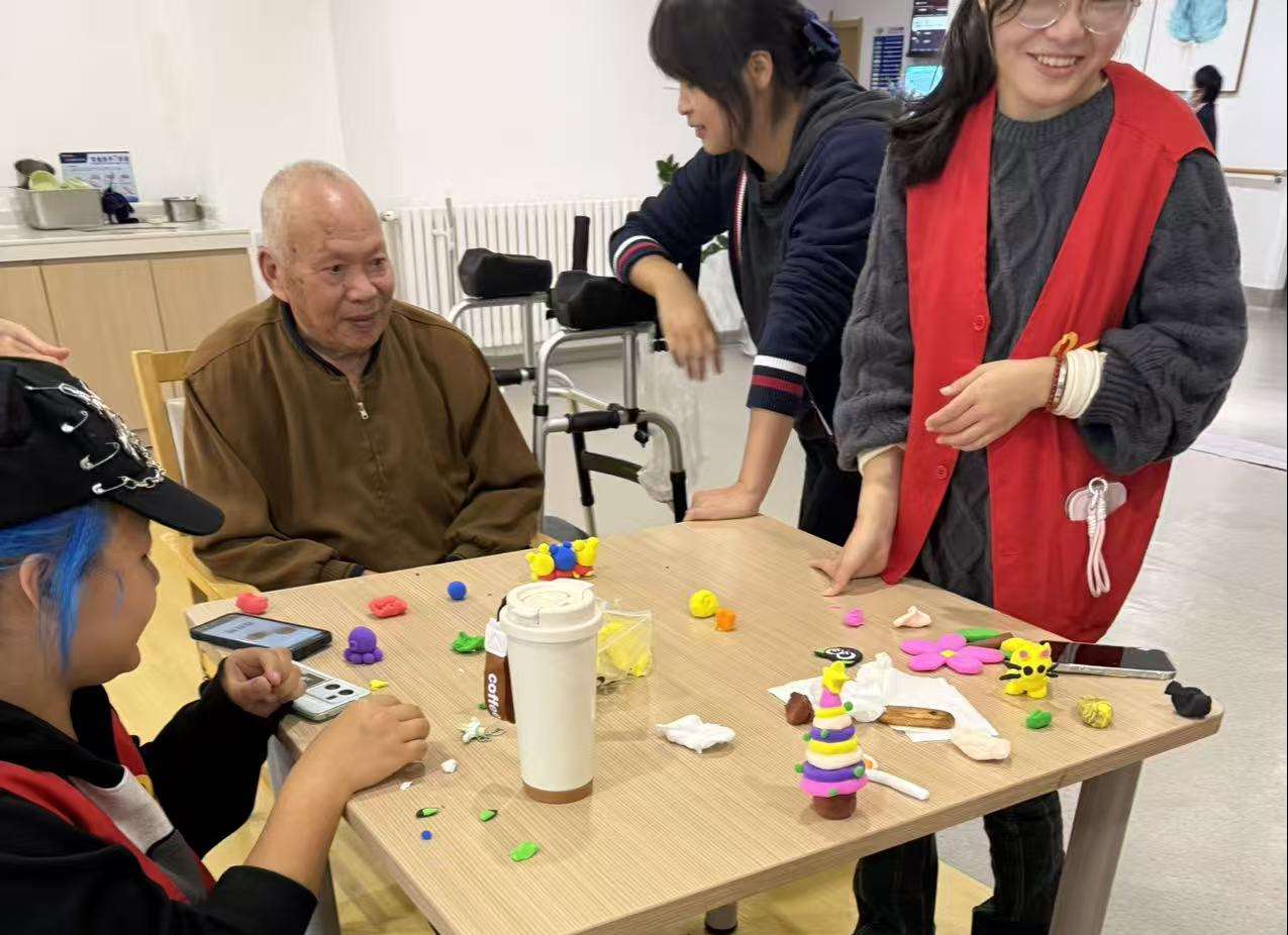 信笺传暖意,学子敬耆老|养老院温暖行 2025年10月23日,河南工业大学爱心同盟及明德先锋青年志愿者协会的志愿者们怀揣着满满的热忱与活力,踏入了寸草春晖敬老院。他们的到来,如同一缕温暖的阳光洒进了这个静谧的角落,将这一天装点成了一个洋溢着欢声笑语、充满人间温情的特别日子。在他们的陪伴下,敬老院里处处流淌着温馨与感动,仿佛连空气都被幸福填满。 一、黏土小乐园,指尖捏出小欢喜 手工区的长桌上,早已摆满了五颜六色的超轻黏土——粉色、黄色、绿色的黏土块堆成了小山头,还有造型可爱的模具和工具。志愿者们拉着爷爷奶奶的手,从最简单的“搓圆球”教起:“奶奶,您把这块粉色黏土放在手心,轻轻搓,就像搓汤圆一样。” 一开始,75岁的张爷爷还有些拘谨,搓出来的圆球总是歪歪扭扭,他笑着摆手:“老了老了,手不听使唤了。”志愿者赶紧蹲下身子,握住他的手一起搓:“爷爷,您跟着我的节奏来,慢一点没关系。”在志愿者的耐心引导下,老人们渐渐找到了感觉:王奶奶用粉色和白色黏土捏出了一朵层层叠叠的玫瑰花,花瓣边缘还细心地捏出了波浪纹;张爷爷则发挥想象力,用棕色黏土做了个小巧的茶壶,还特意用黑色黏土捏了个小壶嘴,摆在桌上像模像样。