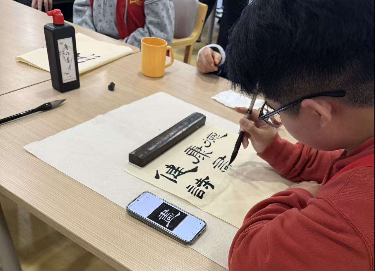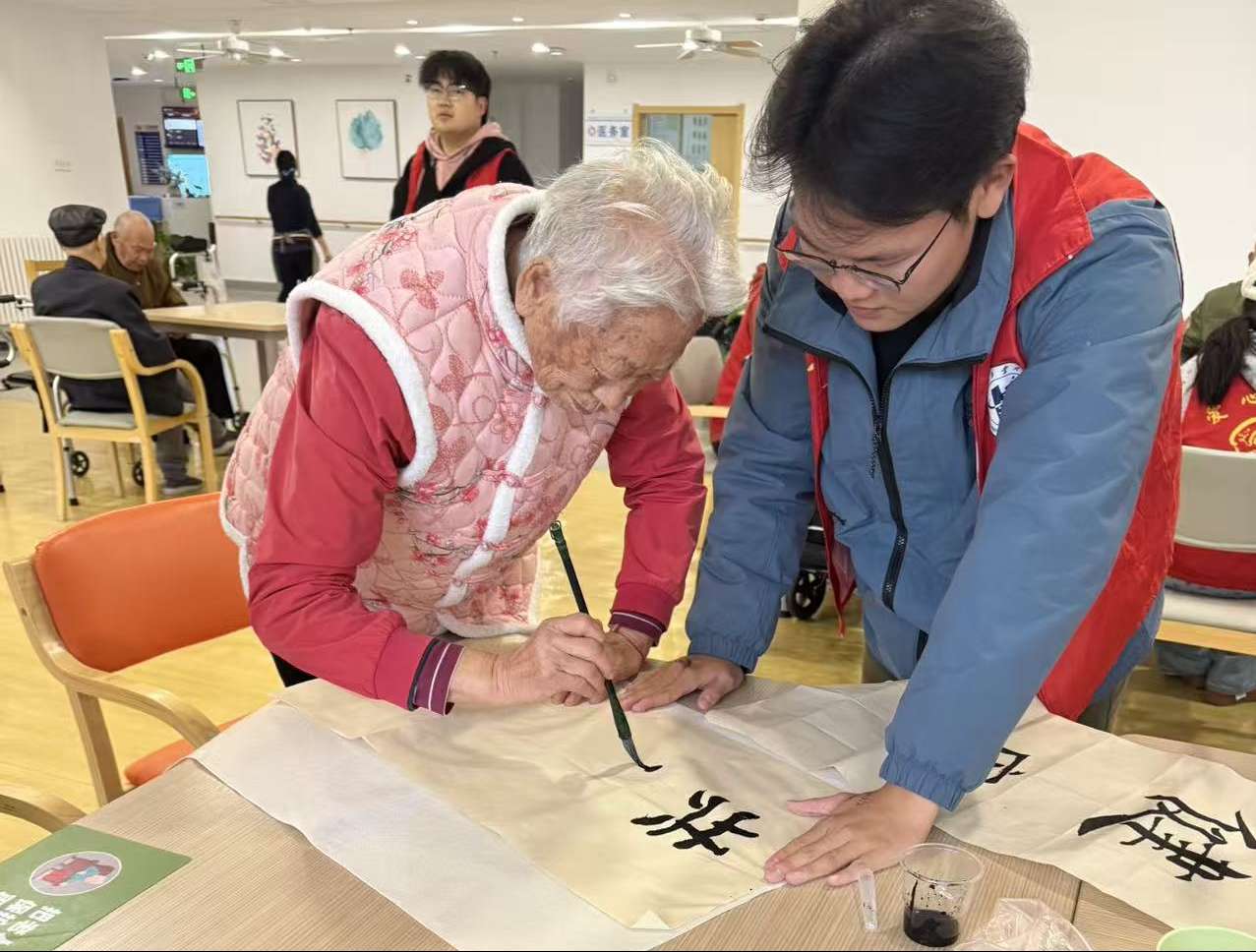 二、墨香传情,一笔一划都是爱 书法区里,洁白的宣纸徐徐铺展,空气中弥漫着淡淡的墨香。志愿者们与爷爷奶奶围坐桌旁,执笔蘸墨,挥毫书写。笔尖轻触纸面,墨迹流淌间,一幅幅或苍劲有力、或温润流畅的字迹跃然纸上。时光仿佛在这一刻静止,墨香与欢声笑语交织,勾勒出一幅温馨而雅致的画面。