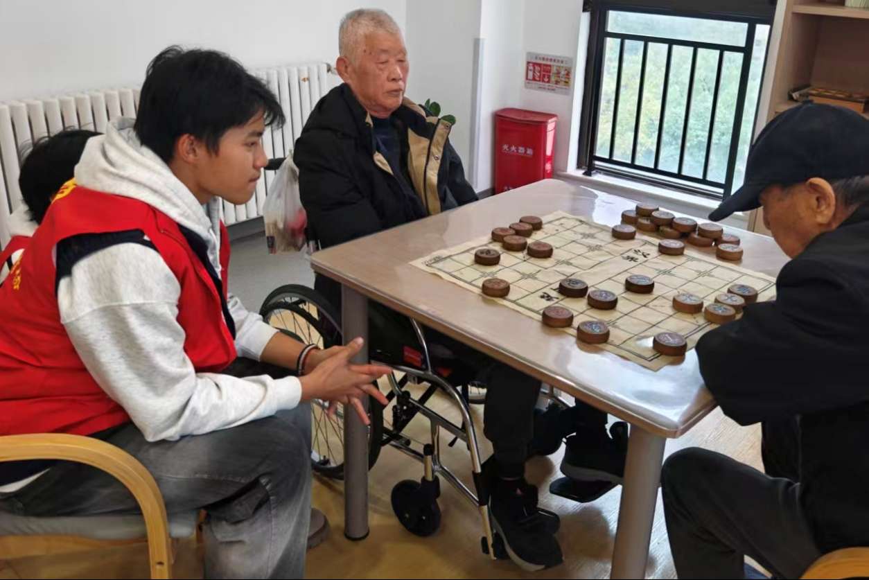 阳光透过窗户洒在纸上,墨水的香气与温暖的笑声交织在一起。老人们的笔锋沉稳有力,志愿者们的笔触认真可爱。 “吉祥如意”“福寿安康”……每一个字都写满了祝福,更写满了两代人之间的默契。 三、棋盘对弈,笑声满堂 在象棋区,志愿者与爷爷奶奶们围坐在一起,摆开棋局,展开了一场场智慧与乐趣的较量。你来我往之间,欢声笑语不断,气氛温馨而融洽,仿佛每一步棋都串联起几代人的情感与默契。 一位老爷爷拿起“炮”,笑眯眯地说:“小伙子,我这招‘马后炮’,你可得小心了!”志愿者也不示弱,沉着应对,两人你来我往,棋局紧张又不失趣味。旁边观战的爷爷奶奶们不时出谋划策,气氛热闹非凡。