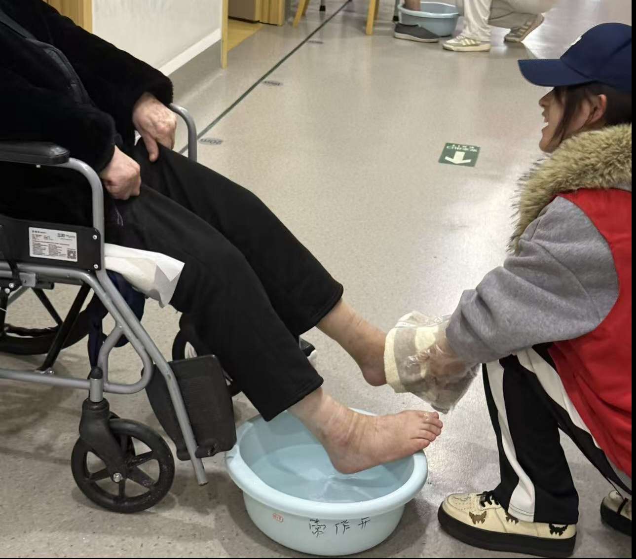 四、暖心瞬间:洗脚与切水果 ——温热的水,温暖的心 志愿者们端来温热的水盆,轻轻帮爷爷奶奶脱下袜子,将他们的脚小心地放进水里。温热的水流过脚底,带着恰到好处的暖意,慢慢浸润着老人们略显粗糙的皮肤。志愿者的手轻柔地揉搓着脚背、按压着脚心的穴位,动作放慢再放慢,时不时轻声问一句“奶奶,水温可以吗?”“爷爷,这样力度会不会太轻?”