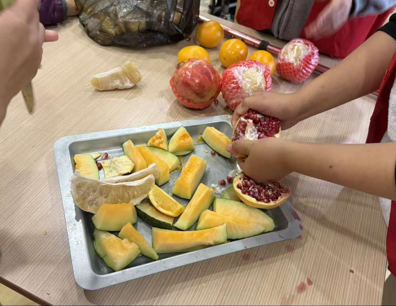 82岁的王奶奶眼眶微微湿润,枯瘦的手轻轻拍着志愿者的手背,声音带着一丝哽咽:“多少年没人给我洗过脚了,这孩子就像我的亲孙女,手比我家娃还轻软。” ——甜美的水果,甜甜的笑 另一边,志愿者们正细心地处理着水果:石榴被剥成一颗颗晶莹剔透的“红玛瑙”,哈密瓜切成厚薄均匀的月牙片,柿子则削去外皮切成小块,整齐地摆进铺了保鲜膜的白瓷盘里。
