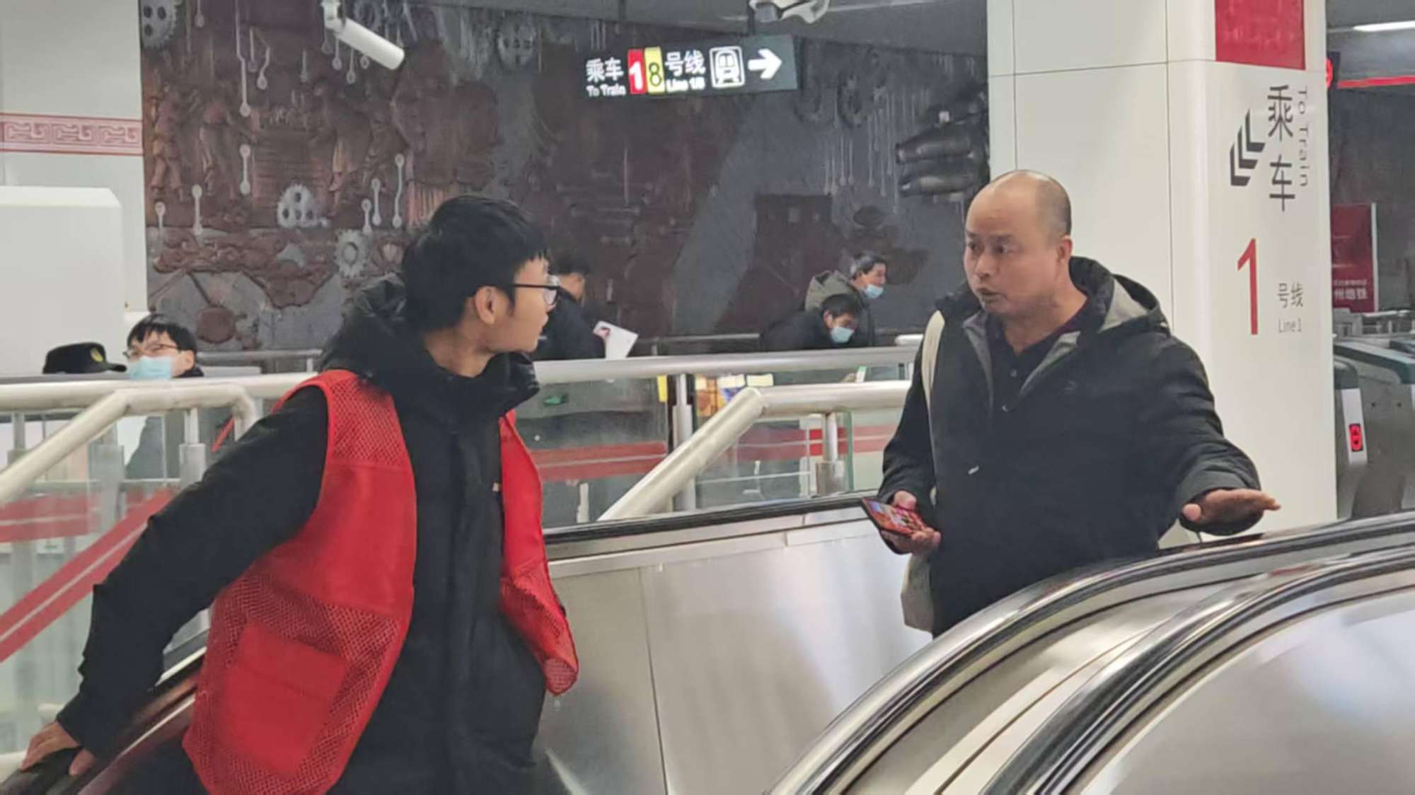 自动扶梯匀速上行,志愿者与乘客并肩而立,身体微微转向对方,专注聆听着乘客关于换乘路线的疑问。他没有因为身处移动的扶梯而敷衍了事,而是在短短十几秒的时间里,用简洁清晰的语言给出了精准指引:“您到楼上后左转,就能看到1号线的乘车标识,直接过去就可以换乘。”乘客原本略带迷茫的神情在他的讲解中逐渐明朗,轻轻点头表示理解。这种“移动中的服务”,打破了固定点位的局限,让志愿帮助渗透到出行的每一个环节,既不耽误乘客的行程,又高效解决了问题,是地铁志愿活动中极具巧思的温暖细节。
