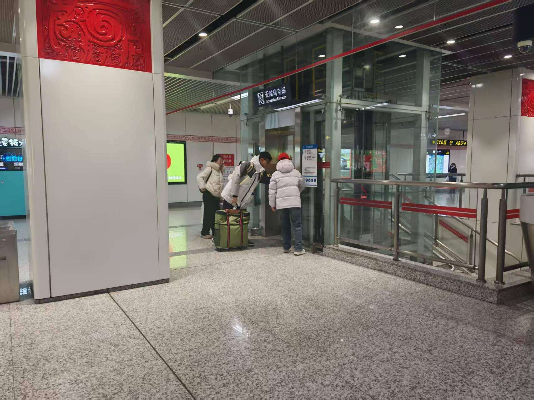 台阶上,志愿者主动接过乘客手中沉重的行李箱,稳稳地帮其搬上楼梯。在没有自动扶梯的区域,这看似微小的举动,却能让拖着行李赶路的人瞬间卸下疲惫。 一句“我帮您吧”,一次有力的托举,让陌生人之间的距离在冬日里悄然拉近。无障碍电梯前,志愿者主动留意到拎着大件行李的乘客,默默陪伴在侧,随时准备提供帮助。这份细致的观察与主动的关怀,让特殊需求的乘客感受到被重视的温暖。