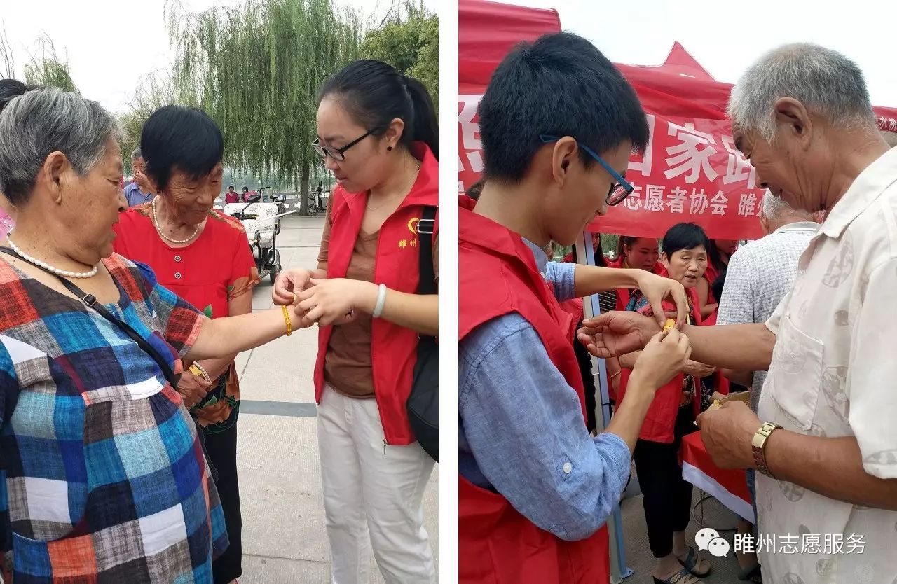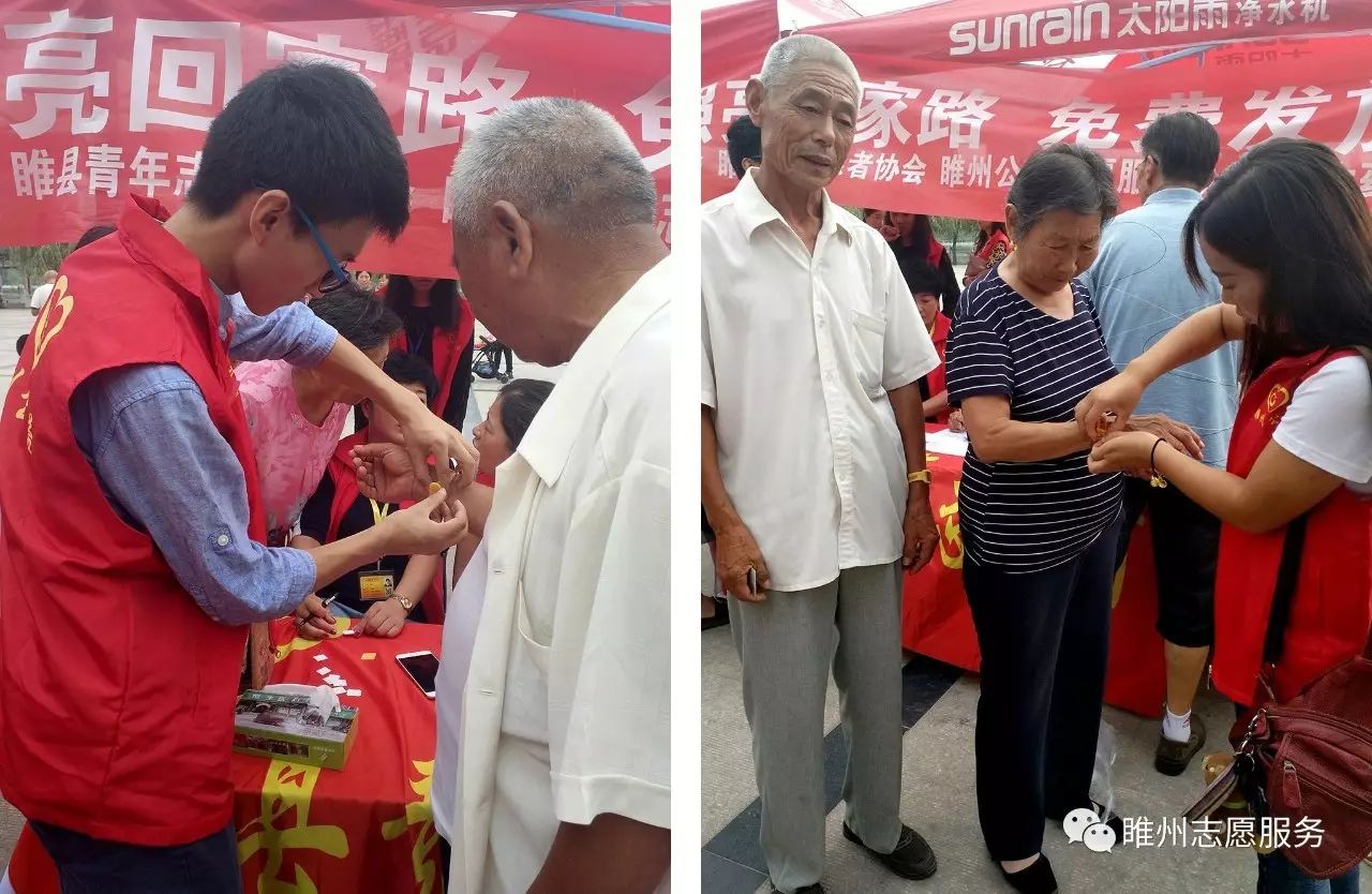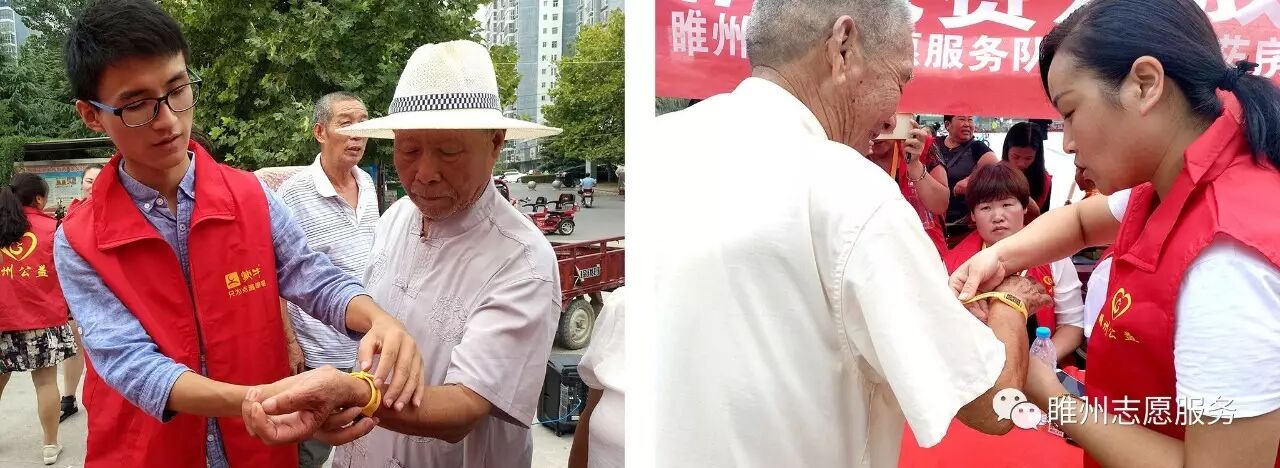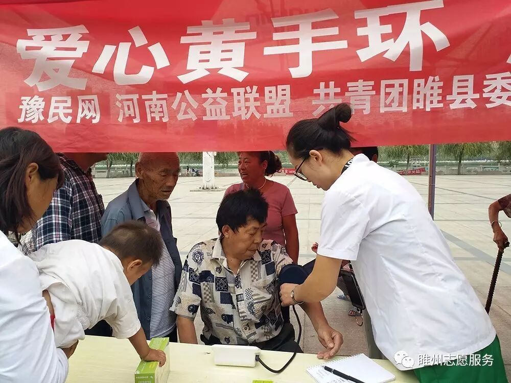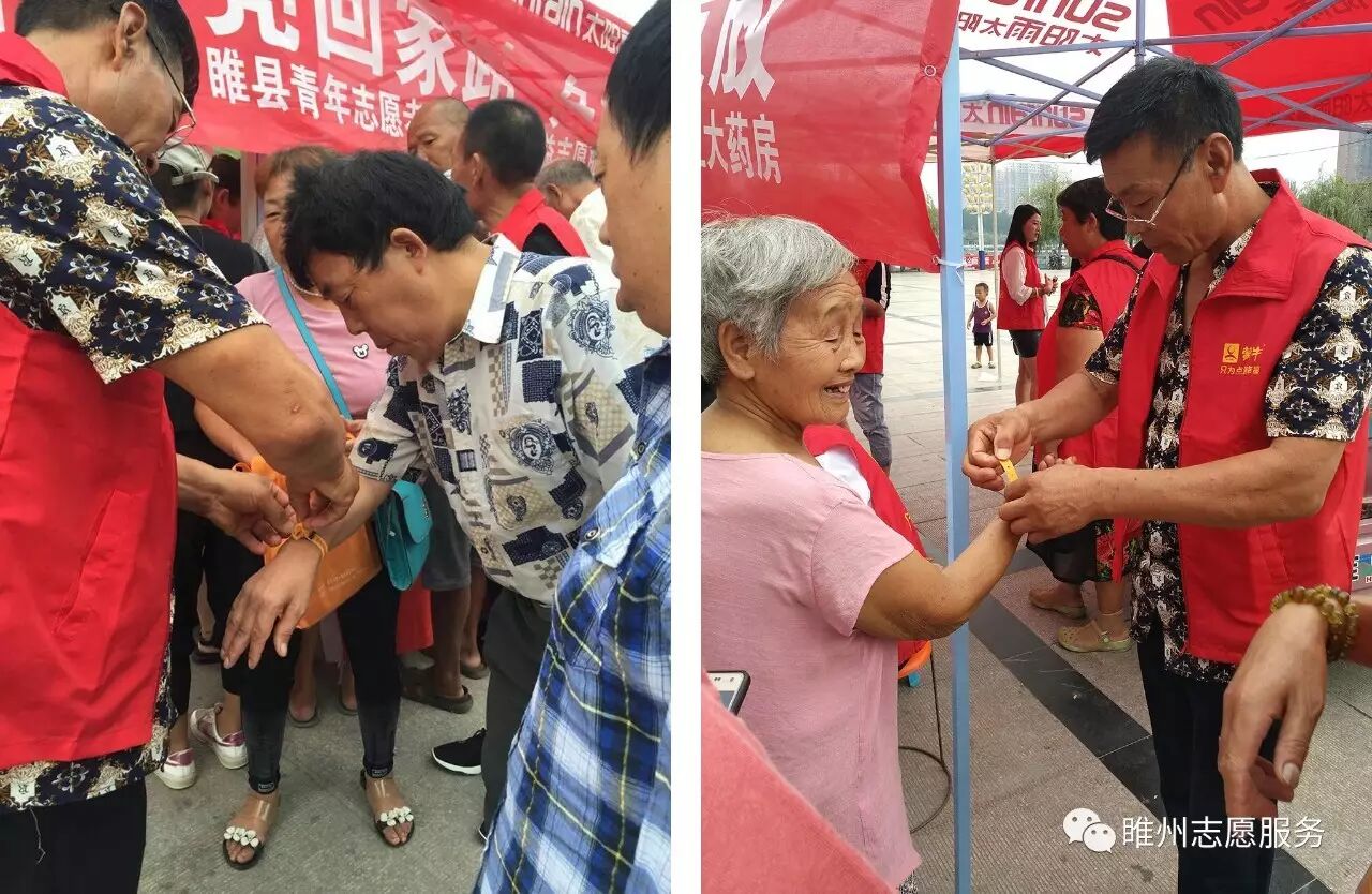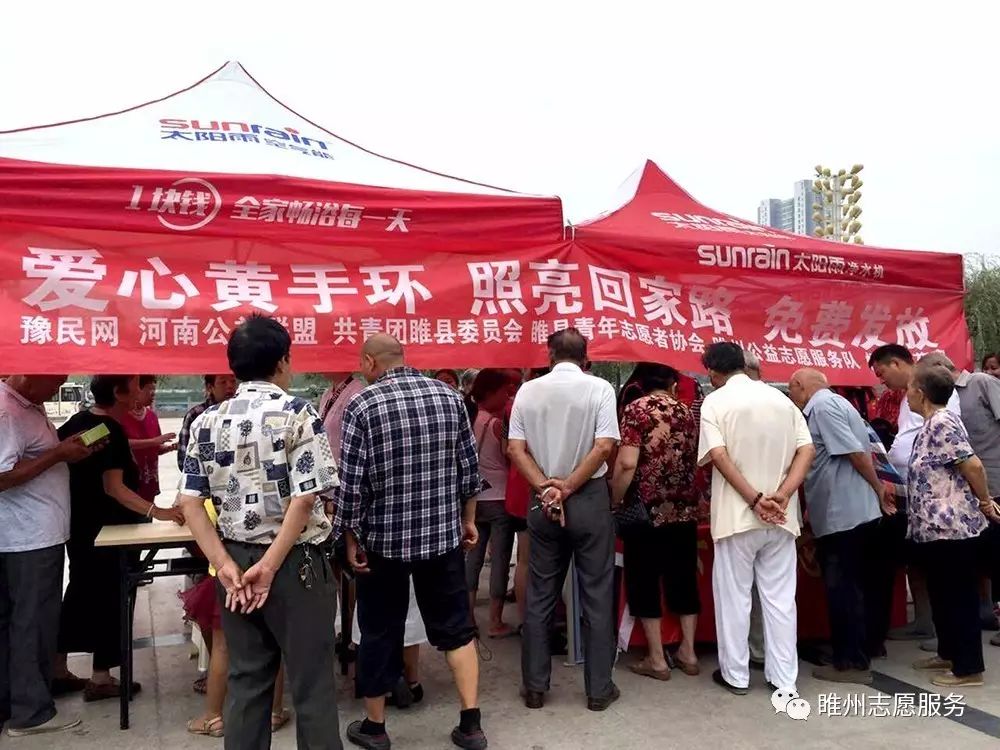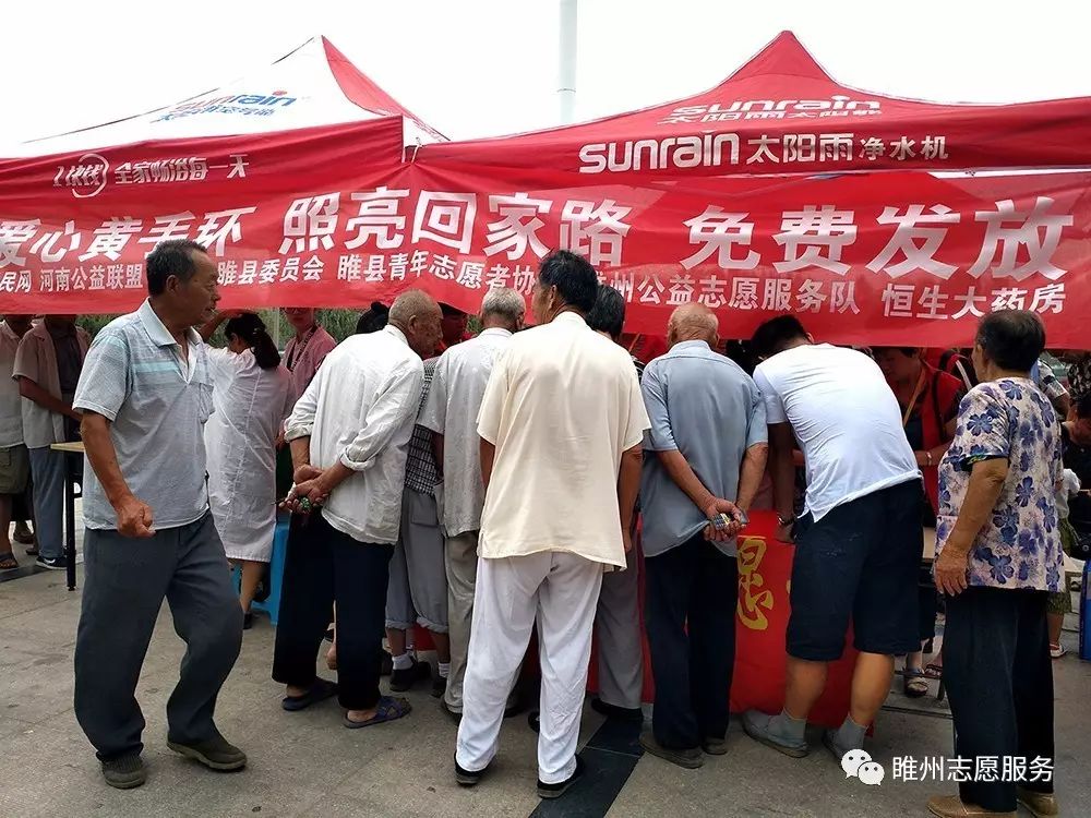 2017年8月26日由豫民网·河南公益联盟主办;共青团睢县委员会、睢县青年志愿者协会、睢州公益志愿服务队承办;恒生大药房协办的《爱心黄手环  照亮回家路》感恩开启!活动参与人数众多,活动同时开展为老人免费义诊和免费理发。炎炎烈日,汗如雨落,志愿者家人的热情依然不减,耐心讲解、悉心指导,让老人们感到满满的爱!志愿者们忙碌的登记老人们的信息