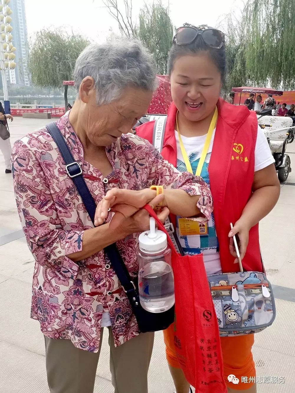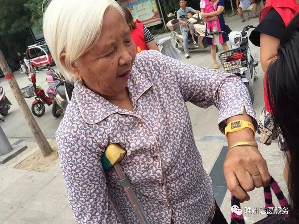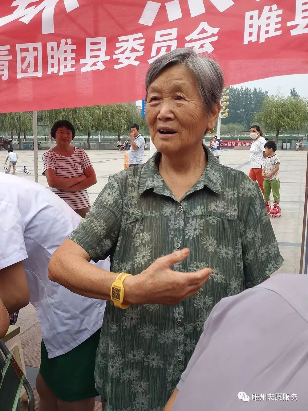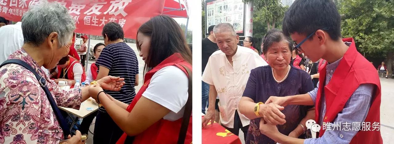 志愿者热心的为老人们佩戴上黄手环