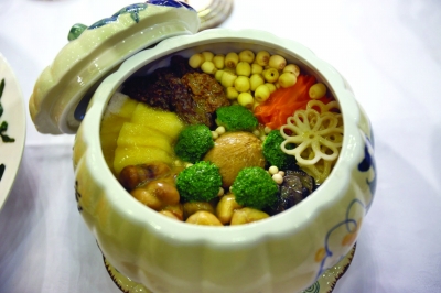 材料:香菇、黄豆芽、荔浦芋头、混合蔬菜、素油 相传,一位不知来历的高僧光临福建传经布法,与他的寺院相毗邻的一家菜馆,时常有一种菜肴飘出异样的香味,令他蠢动凡尘之念。终于有一日,他按捺不住,跳过墙去,一饱口福,以至破了戒规,传说不见经传,却在民间流传。 素佛跳墙由闽菜中首屈一指的名牌佳肴佛跳墙演变而来,用素食材料烹调的佛跳墙。佛跳墙根据选不同的食材,有不同的做法。素佛跳墙香味浓郁,营养丰富。佛跳墙用料讲究,制法独特,滋味香浓而驰名中外。 素佛跳墙是用多种不同主料、辅料融合加工调制后,分层装进煨器中,就好像一部野心勃勃的贺岁片,大腕荟萃自然不同凡响。 佛跳墙的煨器一般选用的是绍兴老酒坛。佛跳墙讲究储香保味,料装坛后先用荷叶密封坛口,然后加盖。用质纯无烟的优质炭,旺火烧沸后再用文火煨五六个小时,便大功告成。 简易素佛跳墙的食谱 作法: 1、用黄豆芽和香菇加水熬制素高汤,煮30到40分钟然后过滤,清汤加盐调味留用。 2、将切成块的荔浦芋头过油炸,以保持外硬内软,然后把烤麸也过一下油待用。 3、在用沙锅内铺上炸过的芋头,再将所有主料一次摆放成型,可以多铺一次主料并向碗内注入素高汤,直至刚刚没过主料。 4、上笼屉大火至上气后转中小火,保持上气状态蒸一个小时,使所有材料都入味。最后在炒锅内加少许素油翻炒混合蔬菜,薄盐调味,勾芡,浇在成菜上即可。
