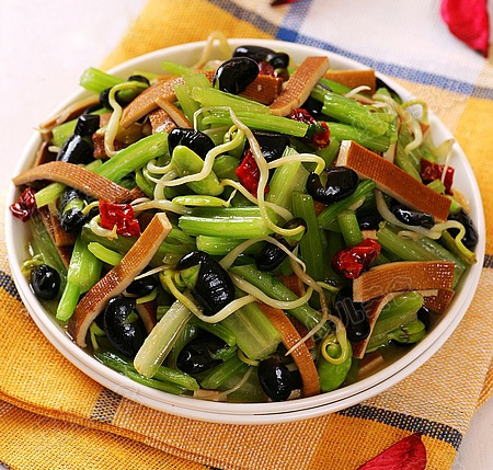 主料:250克芹菜、100克黑豆芽、130克卤豆皮、1个干辣椒 调料:姜5克、3/4茶匙盐、1/4茶匙味精、适量水淀粉、熟植 制作步骤: 1、黑豆芽洗净。 2、芹菜择洗干净切段。 3、姜切丝,干辣椒切段,卤豆皮切丝。 4、锅内水烧开,放入黑豆芽。 5、焯烫3分钟后捞出备用。 6、另起油锅,爆香姜丝、干辣椒。 7、放入芹菜略炒。 8、再放入卤豆干。 9、然后放入焯过的黑豆芽,加盐。 10、翻炒1分钟左右,用水淀粉勾芡,加少许熟植物油炒匀即可出锅。 注意事项: 1、黑豆芽不能生吃,这道菜又需要急火快炒,所以黑豆芽要提前焯水制熟。 2、爆香姜辣椒的时候要小火,不能煳了。