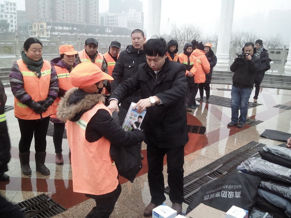 1月27日早晨,正值五九,潢川迎来羊年的第一场雪,天气骤然寒冷。但在潢川县双柳树镇和城区却出现一派派热闹的景象。原来这是潢川农民工黄德宝出资两万余元会同有关领导先后为30名双柳树镇环卫工人和80名城区环卫工人进行慰问的现场,每位环卫工人领到一个印有“潢川环卫”的棉大衣和一个优质保温杯共计210元的慰问品。 仪式上,黄德宝与其他领导同站在寒风中,向辛勤工作在环卫战线上的广大干部职工表示节日的慰问和崇高的敬意,并做了热情洋溢的讲话。他说,近年来,县委、县政府高度重视环卫事业发展,不断加大环卫投入力度,加快环卫体制改革,努力提高环卫职工的福利待遇,环卫工作条件日益改善。通过环卫工人辛勤工作,潢川县创卫工作取得了明显效果,潢川县城市面貌发生了很大变化,为老百姓的出行提供了方便,真正做到了‘辛苦他一个,幸福千万家’,这些都凝聚着环卫工人的汗水。同时,也希望广大环卫工人继续发扬“特别能吃苦、特别能战斗、特别能奉献”的优良作风,立足本职,再创佳绩,在新的起点上为全县环卫工作做出新的更大的贡献。 据了解,黄德宝是潢川县双柳树镇晏岗村曹冲村民组村民,凭着吃苦耐劳、顽强拼搏的精神取得了事业的成功。在事业成功后,他积极热衷公益事业,为家乡修路、关爱农民工、参与光彩助学、关爱环卫工人、救助贫困人们,深受当地党委、政府和社会各界人士好评。(李健 瓮启兵)