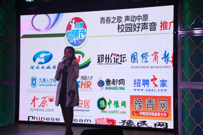 11月23日,由河南科技报创新周刊、河南电视台《美丽家园》栏目、户外频道《淘最河南》联合打造的青春之歌声动中原九博杯校园好声音选拔赛第一季正选赛在郑州市紫荆山路k秀馆激情唱响,来自省会多所高校的28位校园实力歌手火热PK、高潮迭起,整场比赛持续近3个小时,选手们的精彩表现赢得现场观众此起彼伏的掌声。最终,来自河南财经政法大学的李晗和黄河科技学院的侯汶序凭借出色发挥并列第一名,第二名和第三名分别被来自同一所学校中原文化艺术学院的邹望和彭璐璐摘得。 比赛间歇,郑州知名乐队鼎摇滚乐团主唱朱四伟也脱袍上阵,为师弟师妹们加油助力,倾情演绎的一首beyond的《海阔天空》,将现场气氛推向高潮。 据悉,青春之歌声动中原校园好声音选拔赛将持续举办多期,最终在2015年五四青年节前夕组织大型总决赛晚会,每一季前三名参与最终PK,决出河南校园最好声音。同时,由每一季选手组成的大学生青春之歌艺术团也将持续招募并进行专业打造,由她带来的《青春之歌演唱会》也必将成为省会绽放正能量华彩的重要公益力量。