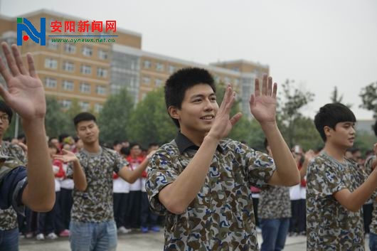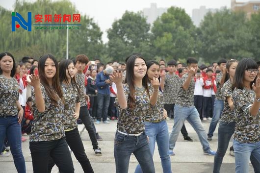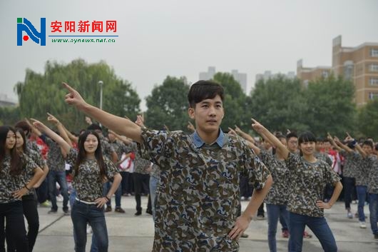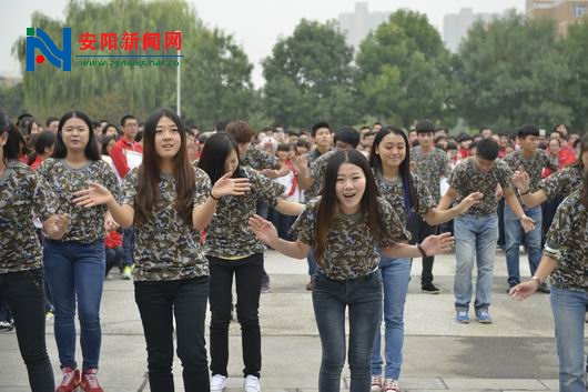 日前,安阳工学院2014级新生军训正常进行。下午16点左右,50余名身着迷彩上衣、洋溢着青春活力的大学生们突然集合在校图书馆前,为正在休息的大一新生们献上了一支“快闪”舞蹈《小苹果》,为军训中的校园增添了一道别样的风景。