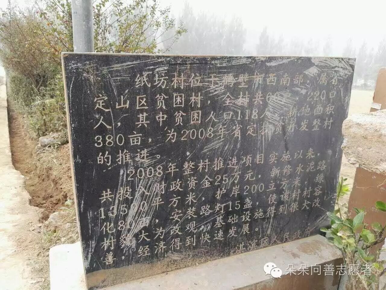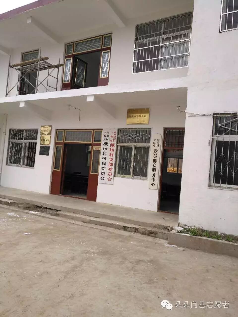 第二站是纸坊村。纸坊村是省定山区贫困村,总人口220人,贫困人口高达118人(2008年统计)。志愿者们在村民委员会房前大致设计了爱心墙,以期能够帮扶所需人群。 志愿者和领导们在纸坊村前合影。