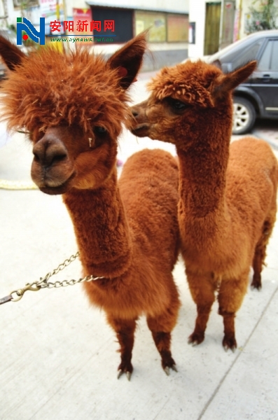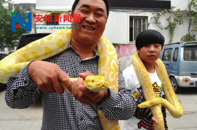 两只羊驼可爱又温顺 10月10日,安阳市唐子巷唐龙家园门口围着好多人,有很多市民纷纷掏出手机一个劲儿地拍照,这到底是在干嘛? 记者挤到前面,只见足有成人手腕粗细的一大一小两条金黄色的蛇在地上缓慢爬行,不远处还一前一后地站着两只深咖色的“神兽”羊驼。 “那两条金黄色的大蛇叫黄金蟒,大的那条我养了四年多,现在有50多斤重。”市民朱先生向记者介绍道。 旁边围观的小朋友谁都不敢摸黄金蟒,朱先生笑着告诉他们:“其实黄金蟒性格很温顺,你只要尊重它、善待它,它是不会咬你的。你看它昂着头,那不是要袭击你,是想爬的更高些。” 在朱先生的鼓励下,一些胆大的小朋友伸出小手好奇的轻轻抚摸黄金蟒。 据朱先生介绍,他是安阳市水冶镇人,家里开了一个农场,农场里除了饲养猪、羊等家禽外,还专门养着蜥蜴、鳄鱼、黄金蟒、羊驼等二、三十种稀奇古怪的动物。“那两只羊驼是我一年多前花了十几万元专门从澳大利亚买回来的,它们每天吃一些草和玉米之类的东西。黄金蟒就不一样了,每天都要喂活的兔子和鸡,再算上其他动物,每个月饲养费就是一笔不小的开支。” 既然开销不小,为什么要自费饲养这些并不省心的动物呢?朱先生有他自己的想法:“俺们水冶镇没有动物园,村民也都没见过,我就想着自己养一些稀奇的动物,让大家都来看看,也算能长点见识吧。”记者毋怡秋/文王大川/图