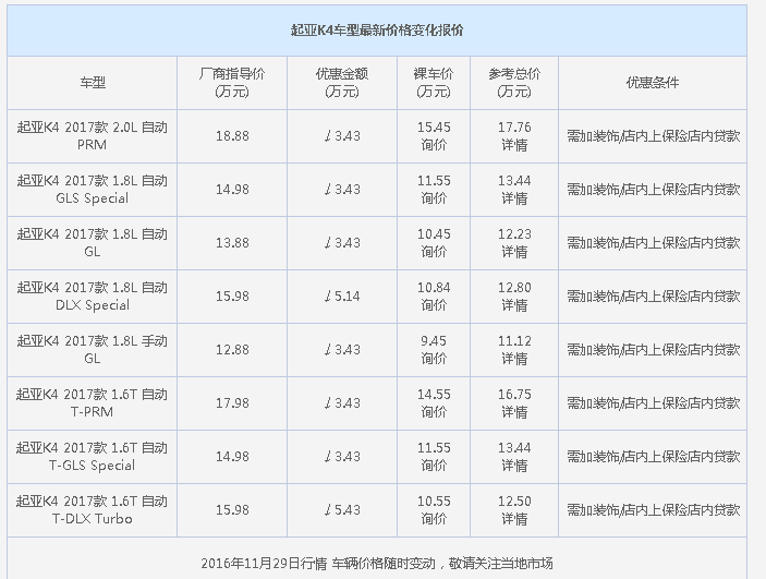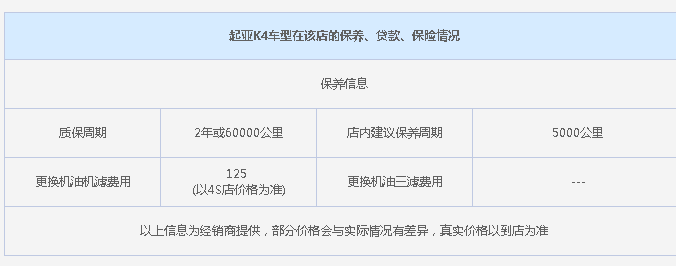 近日,笔者从郑州恒信国亚汽车4S店获悉,K4综合优惠54300元(现金+礼包+精品),实体店交易服务舒适交易更放心,本月厂家直销万人团购会,部分特价车型8.5折,限时销售! 全系车型起亚厂家金融分期最低30%首付,零利息!首付40%只需一张身份证,爱车轻松“贷”回家!更有一年弹性贷无月供! 到店试驾购车更有5000元大礼包相送, 不管您现在是马上购车,还是打算购车,还是以旧换新,相信您看到的价格,郑州恒信国亚拥有全城更低的价格! 充足的车源,更优质的服务,让您享受实惠,快捷,温馨、愉快的购车过程!恭候您的大驾。 活动预约VIP专享热-线:400-830-4827 地址:郑州市南三环文治路向南800米路西郑州恒信国亚4S店。 感兴趣的朋友可以到店咨询购买,详情见下表: 郑州地区,提供了很多附加增值性服务,如直赔保险和贷款,下表将为您提供更多有用信息: 以上为车型资料信息,本店提供了多项增值服务,感兴趣的朋友欢迎来电咨询。