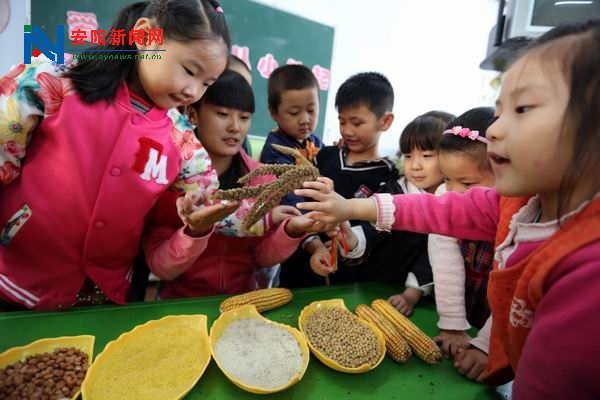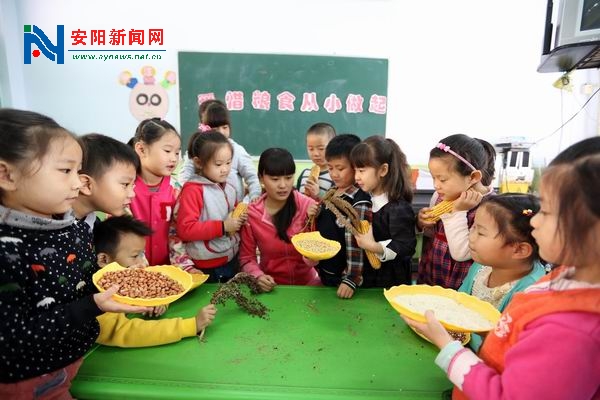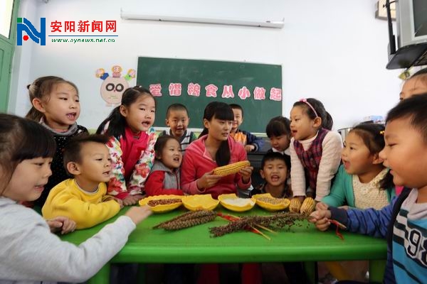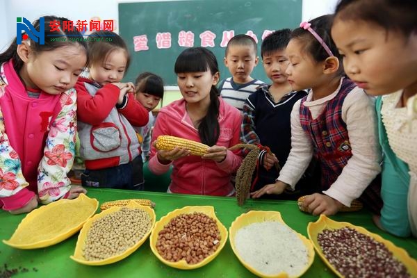 2014年10月13日,安阳妇女儿童活动中心幼儿园,小朋友们在老师的细心讲解下,全面了解粮食的种类,体会粮食种植和收获的不易,从小培养爱粮、节粮、惜粮的意识。