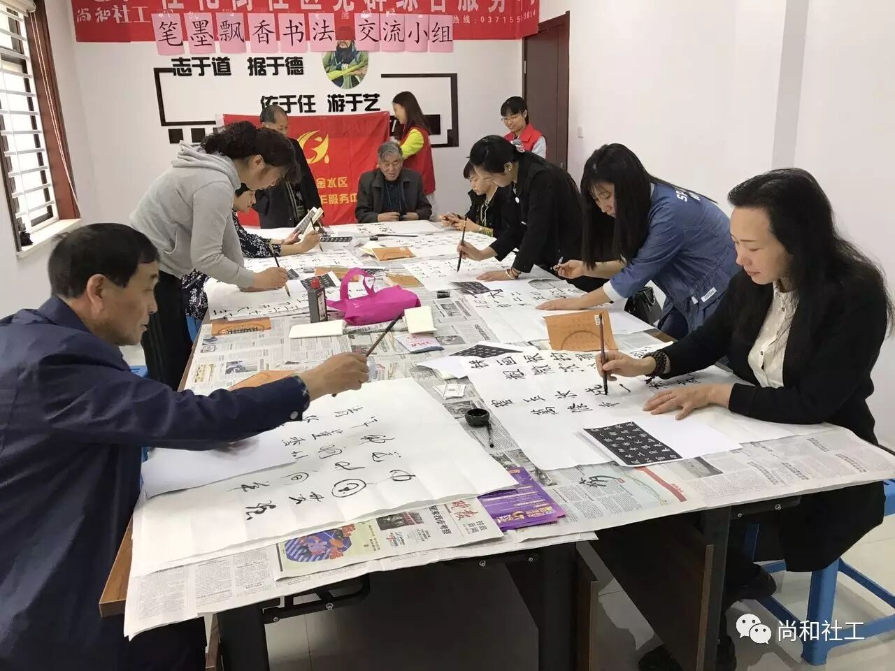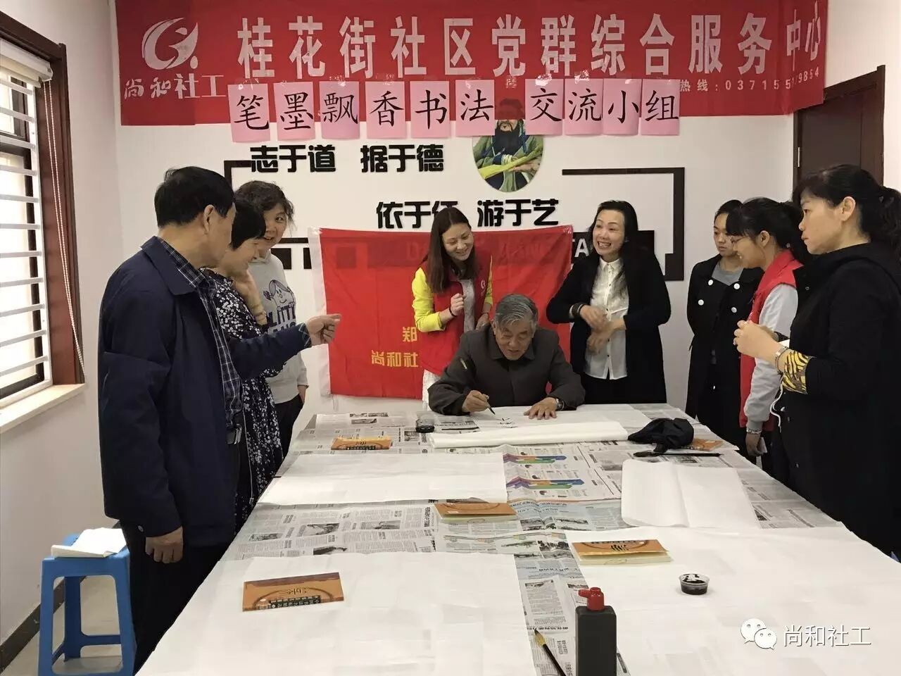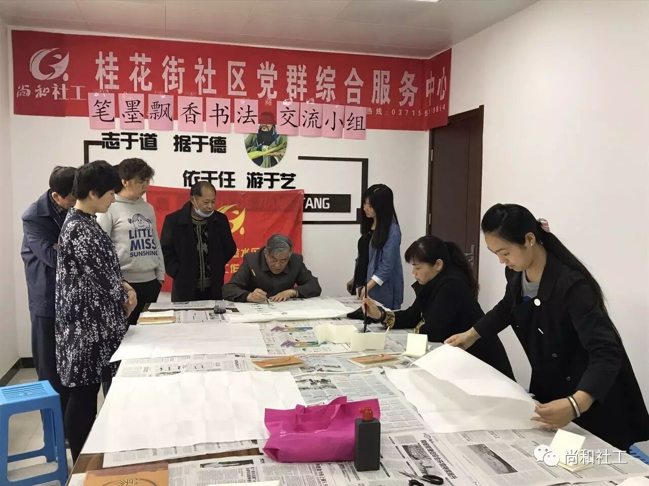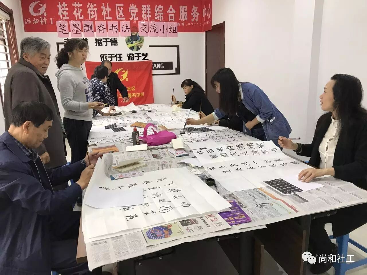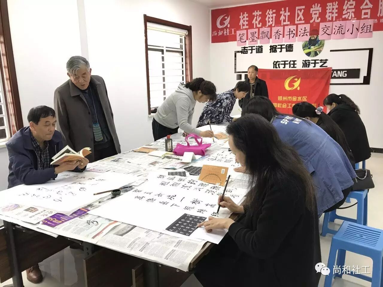 为丰富社区居民的业余生活,为社区居民提供展现自我和扩大社区居民交流的平台,2017年4月25日上午,桂花街社区党群综合服务中心的“笔墨飘香”书法交流小组活动正式开课啦! 活动还没开始,早早来到的殷老师忍不住开始动笔了,瞧!只见殷老师铺开一张宣纸,拿起手边的毛笔,蘸上墨汁,随后纵横于宣纸之上。围观的组员随着殷老师的书写,情不自禁的念了出来:“天街小雨润如酥,草色遥看近却无,最是一年春好处,绝胜烟柳满皇都。”殷老师最后一笔落罢,便赢得组员的阵阵喝彩。 活动正式开始,社工将早已准备好的字帖发送到各个组员的手中,在我们小组组员中,有左手写字比较好的都老师,有80岁高龄书画双全的殷老师,当然还有我们模特队的父女俩…… 经过老师基本的讲解,小组组员们很快进入状态,每个人都专注、认真,一笔一划地书写自己的作品,颇有大家风范。欢乐的时光总是短暂,不知不觉到了结束的时间,社工跟小组组员约定,下节课同一时间、同一地点,不见不散! 在这里,学习书法不仅可以修身养性,陶冶情操,更能以书法为平台,交朋识友;在这里,小组组员们以文会友,互相学习,感受书写的快乐,分享交流的愉悦。
