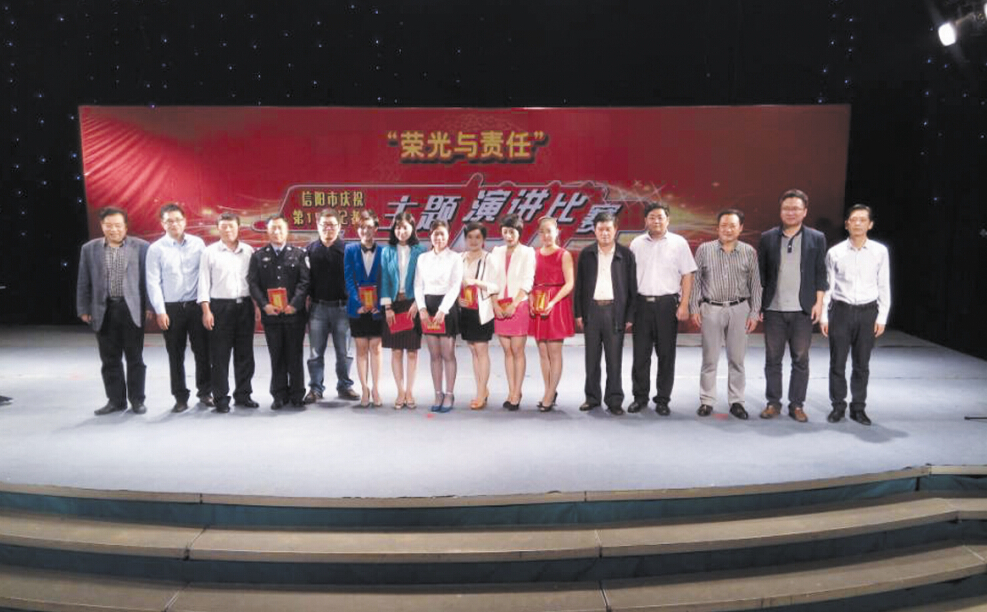 赛后,获奖选手与评委们合影留念。 “……两年前,我与新闻相遇了,从此以后就结下了不解之缘……”周五下午3时,激情澎湃的演讲声在信阳广播电视台的演播大厅内,久久地回荡着,这里正在举行以“荣光与责任”为主题的演讲比赛。 为了庆祝第15个记者节的到来,为了集中展现我市新闻工作者忘我奉献、开拓进取、奋发有为的时代精神,也为了能让一线新闻工作者能够讲心里话、说身边事、谈真感悟,抒发自己从事新闻工作的体会、收获和感受,我市举办了此次演讲比赛。 此次参加比赛的17名选手,是经过各县区、市直新闻宣传单位层层选拔,最终择优推荐的。《平凡与伟大 光荣与梦想》、《承载荣光不负使命》、《一路风雨 一路高歌》……选手们精心准备的演讲稿和真诚地演讲,感染了在场的每一位观众,他们自然、流畅的表达引来了阵阵热烈的掌声,他们的姿势、动作、手势,也增强了观众对演讲的理解。通过他们的演讲,一位位默默无闻的优秀新闻工作者鲜活地涌现在了我们身边,虽然事迹平凡,但却可以通过他们平凡的事件,感受到不平凡的奉献精神。 两个半小时过去了,17位新闻工作者全部演讲完毕,经过评委们的打分,现场产生了一等奖1名,二等奖3名,三等奖3名,其中来自信阳广播电视台的白茹,因为声情并茂的表现力和较强的感染力,夺得了本次演讲比赛的一等奖。本报记者王洋,也因其流畅的表达和富有韵味的吸引力,取得了二等奖的好成绩。 “成绩只属于过去,就像此次演讲比赛的题目一样,既是荣光也是责任!”赛后,王洋对记者说道,“以后我们会更脚踏实地地干好自己的本职工作,展示出新闻人应有的风采!”