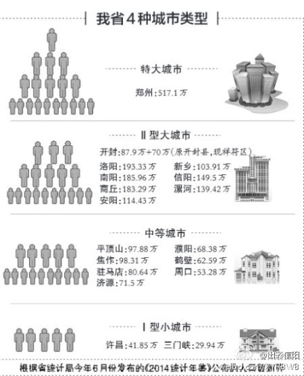 近日,国务院印发《关于调整城市规模划分标准的通知》,对原有城市规模划分标准进行了调整,明确了新的城市规模划分标准:根据常住人口分为五类七档。据省统计局今年6月份发布的《2014统计年鉴》, 省会郑州城区常住人口达到517.1万人,属于特大城市,信阳市以城区常住人口为149.5万人列为Ⅱ型大城市 。