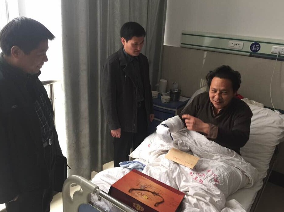 面对歹徒,临危不惧,安徽亳州籍在潢川务工的农民工王东方只身与歹徒搏斗,不幸被乱刀砍伤。经了解王东方右胳膊三根主筋及掌骨的筋均被砍断,脸部及背部亦被砍伤,需及时救治。王东方家有四口人,其本人在圣光集团打工,妻子是农民,无工作,两个小孩均在上学,家庭生活困难,无力承担治疗费用。2014年11月26日上午,信阳潢川县第二人民医院领导带着医院对英雄的牵挂,来到信阳市154医院亲切地看望了王东方并送去了慰问金。 院长王顺成也被王东方的英雄壮举所感动,他紧紧地握住王东方的手深情的说:“你的行为,感动了我们二院全体职工,你的精神值得我们学习,希望你能安心养病,祝你早日康复。”(李健 鲁信义)