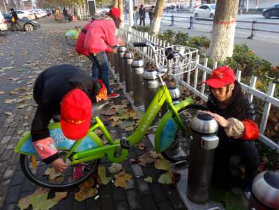 因为刚下过雨,锁车桩和自行车以及控制器都蒙上了一层泥。同学们用抹布一点儿一点儿地擦去自行车和控制器上面的泥土。很快,“小绿”变得干净整洁。