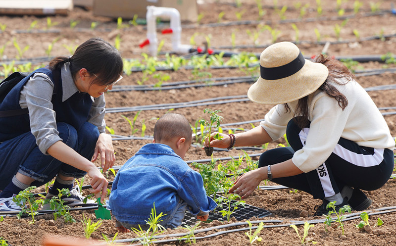 郑州黄河岸边的一个有机生态农场内,孩子们在共享农场内种下西红柿苗。 郑报全媒体记者 马健 摄