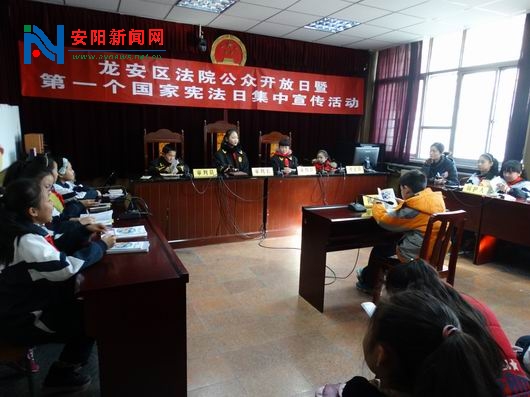 12月4日,是我国第一个国家宪法日。4日上午,安阳市龙安区法院迎来了来自辖区宗村小学的五十余名学生参观。小学生们陆续参观了法院的立案庭、荣誉室、马小新工作室等,最后来到刑事审判庭。平日里庄严神圣的庭审现场就展现在眼前,孩子们竞相上前,扮演审判长、公诉机关和辩护人的角色。少年庭的法官们还给学生们发了普法教育口袋书,并结合典型案例向他们进行了安全和法制教育,鼓励他们好好学习,发奋努力,争做懂法、守法、护法的小公民。(闵文庆 王 颖)