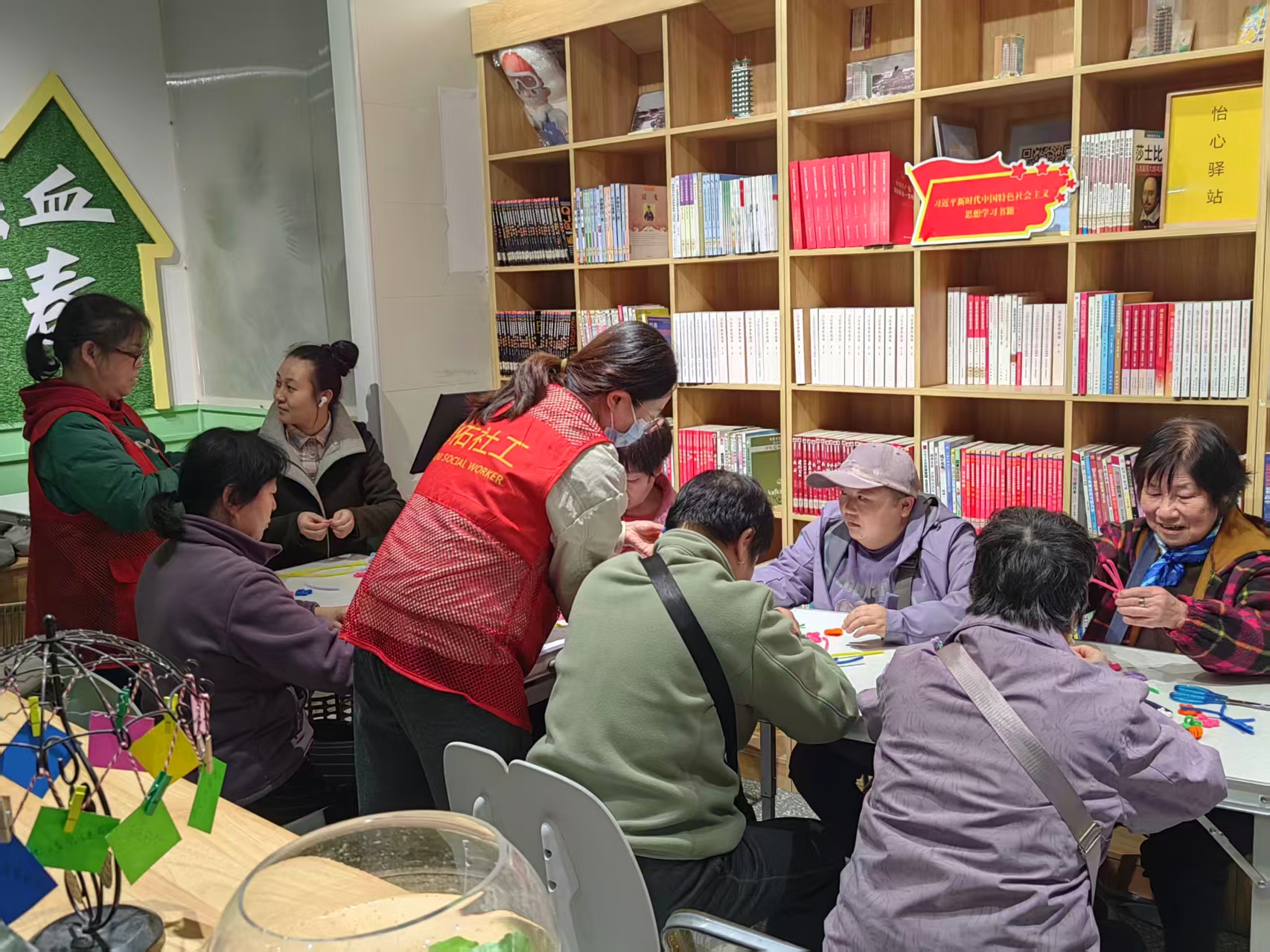 第二节“扭扭棒花朵手环”制作活动中,社工首先向组员们展示扭扭棒花朵手环成品,激发了组员的参与热情。随后,社工将彩色扭扭棒分发给组员,并通过慢动作演示与手势讲解结合的方式,拆解花朵手环制作流程,确保组员能够理解到位。制作过程中,组员们专注投入,不时通过手势交流技巧,社工与社区工作人员也在一旁协助组员完成细节处理。不一会儿,一个个色彩鲜艳、造型别致的花朵手环陆续完成,组员们手持成品相互展示,脸上洋溢着满满的成就感。