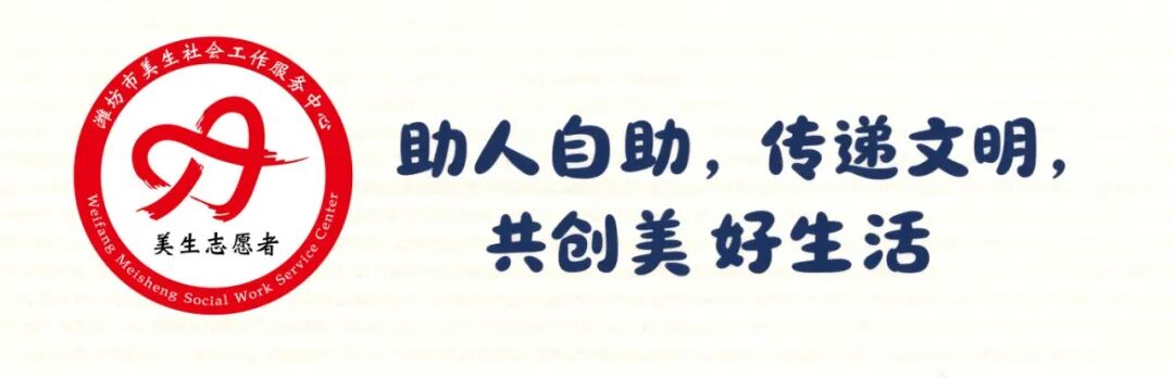 美生社工的服务宗旨是帮助他人,快乐自己,传递文明,服务社会,让需要帮助的人都能拥有美好的生活、美丽的人生!